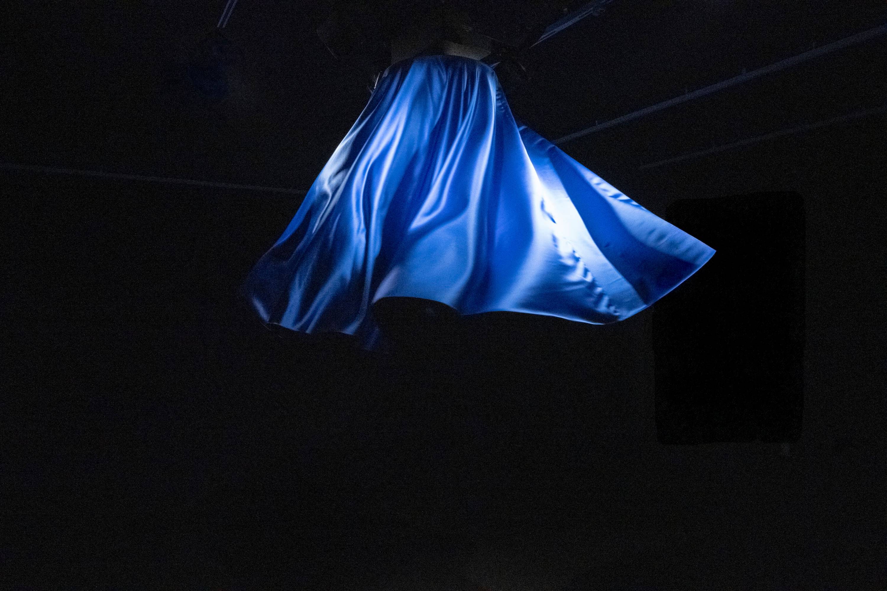 In Catherine Wheel (2026), an illuminated blue skirt spins above the viewer’s head, synchronized with the artist’s uncontrollable laughter. The sound originates from a four-hour tickling session during which Simnett was pushed into an increasingly exhausted and unpredictable state. The resulting laughter – dark, strained, and edged with gallows humour – takes on a possessed, almost satanic quality. The skirt’s relentless movement becomes threatening in its sheer persistence, exerting pressure not only symbolically but bodily, as something that cannot be stopped or escaped.