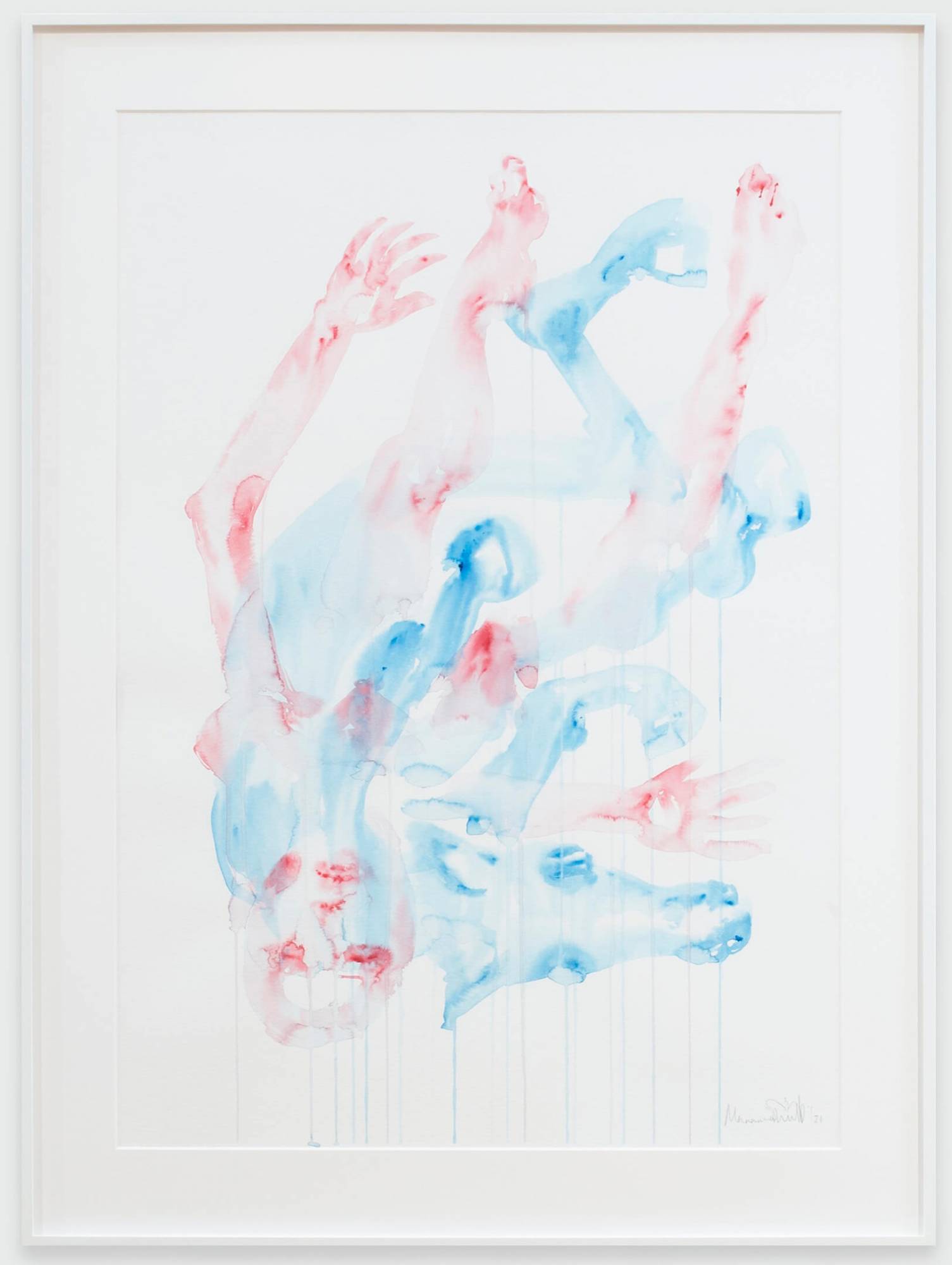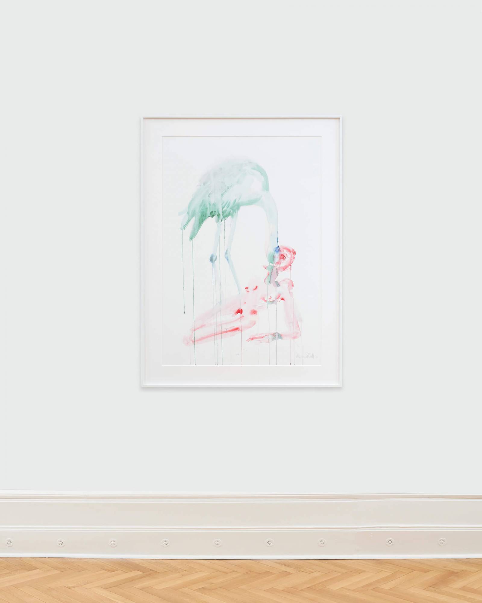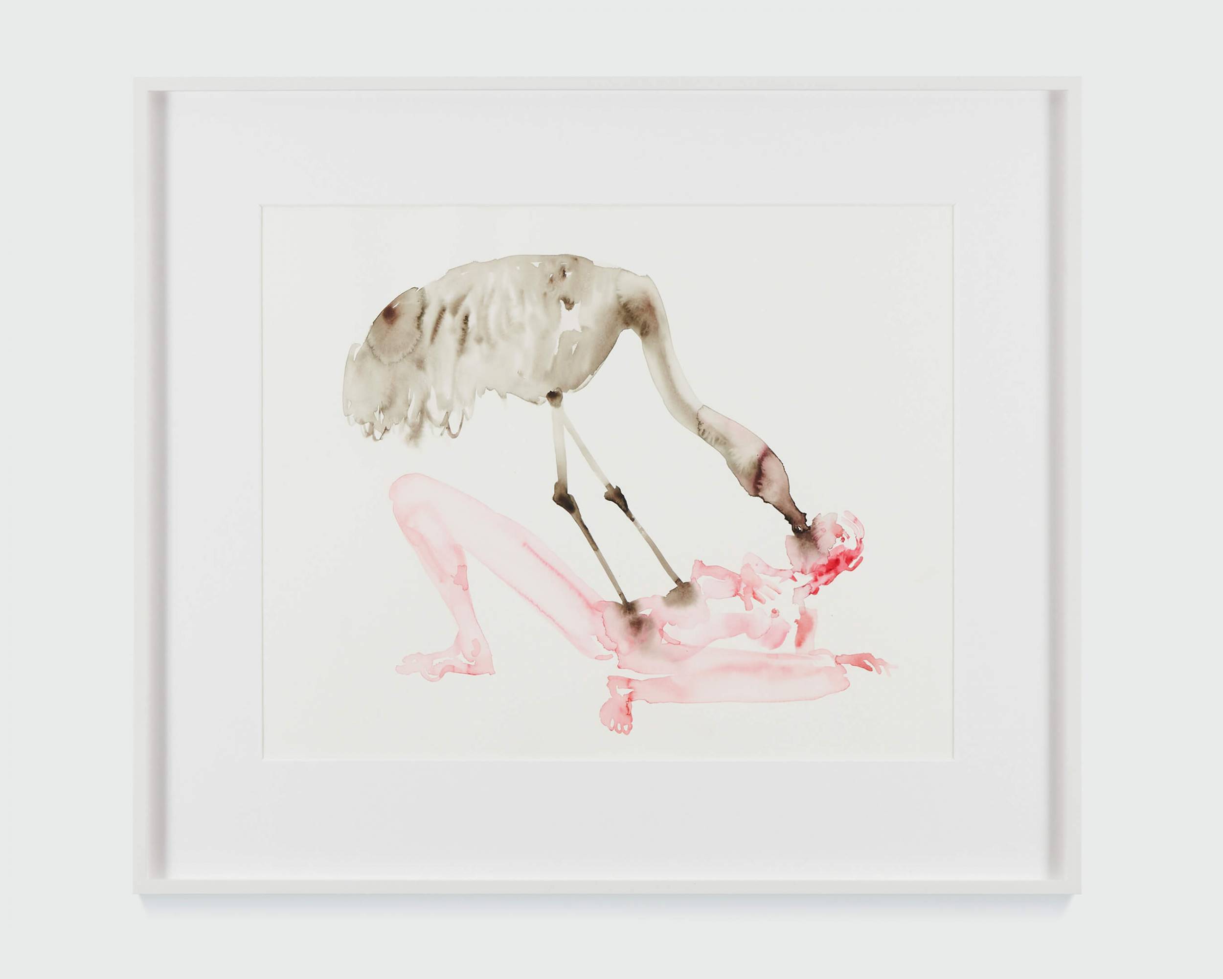 This series explores interspecies love and bestiality, creating emotionally charged constellations that are at once vulnerable, violent, and tender. The bodies are fluid and entangled, the watercolour literally bleeding the forms together. These points of contact between species, rendered in vivid stains of color, gesture towards a mutual transformation.