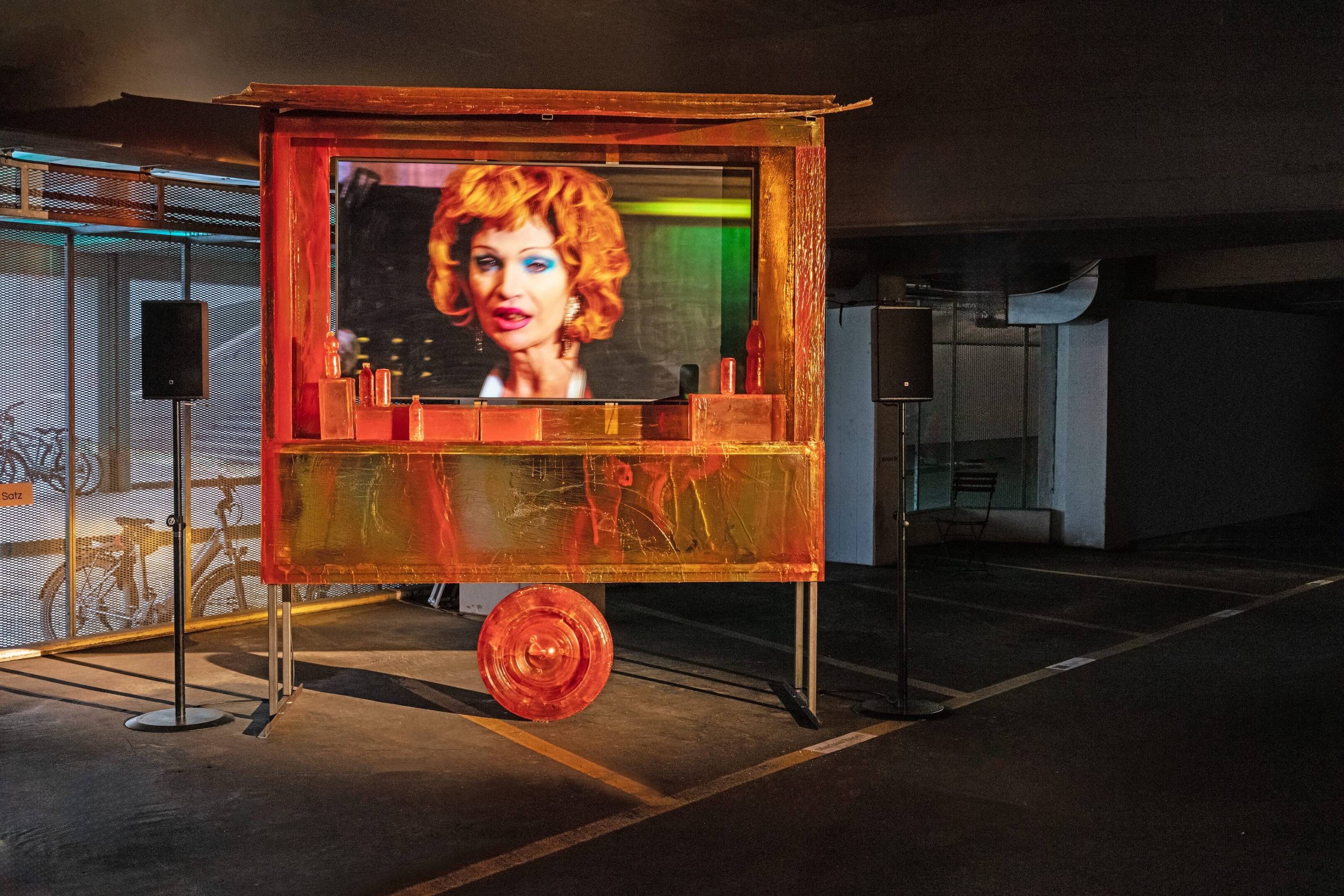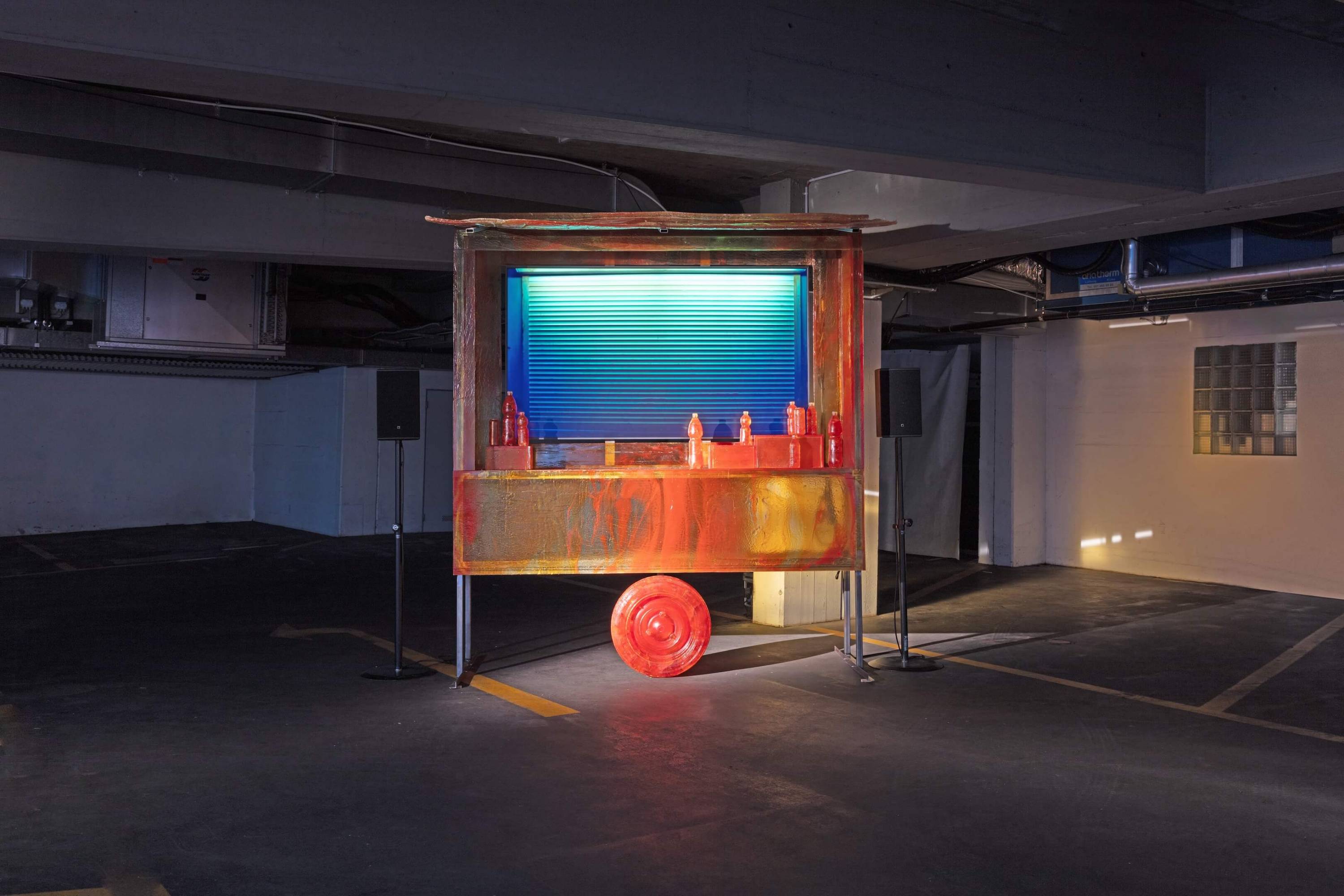 Interlude is an installation consisting of two videos looped within sculptures of concession stands, inspired by those found at sporting events. Rendered in rich ochre, red, and gold tones, the work’s sculptural elements appear illuminated from within by an otherworldly inner glow, giving them a mesmerizing, eerie quality that intensifies when the shutters lift to reveal videos of solitary women singing and preparing food—only to retreat behind the blinds once more.