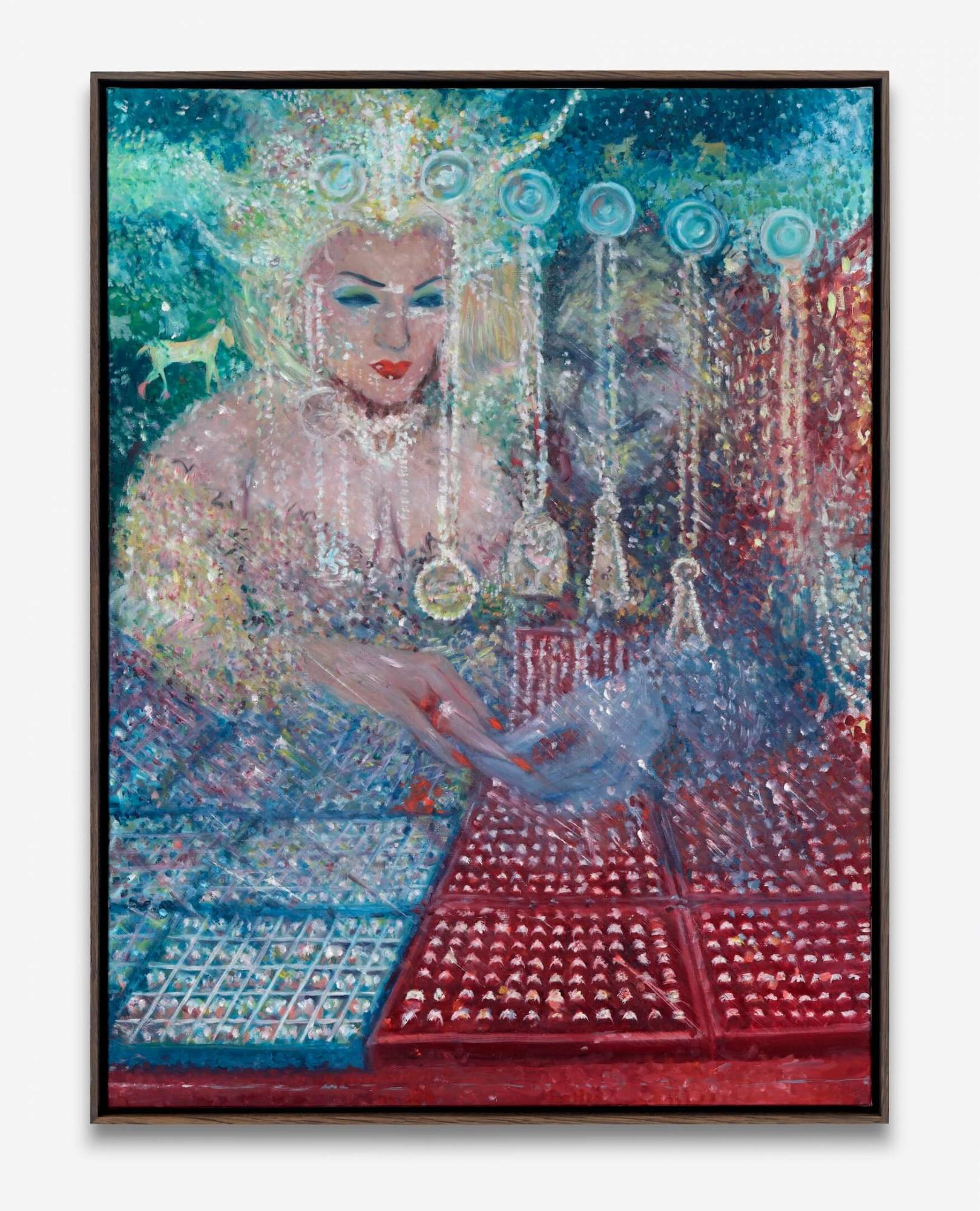 An overarching interest in storytelling pervades Marianna Simnett’s interdisciplinary practice. This foray into oil painting is driven by a desire to experiment with the narrative flow of images beyond time-based media. While film presents a linear visual narrative, Simnett’s paintings are constructed in sedimentary layers, functioning as short stories that collapse different temporalities and images into a single surface. Built up over many days, she employs numerous layers of translucent paints to create a shimmering, glass-like effect.