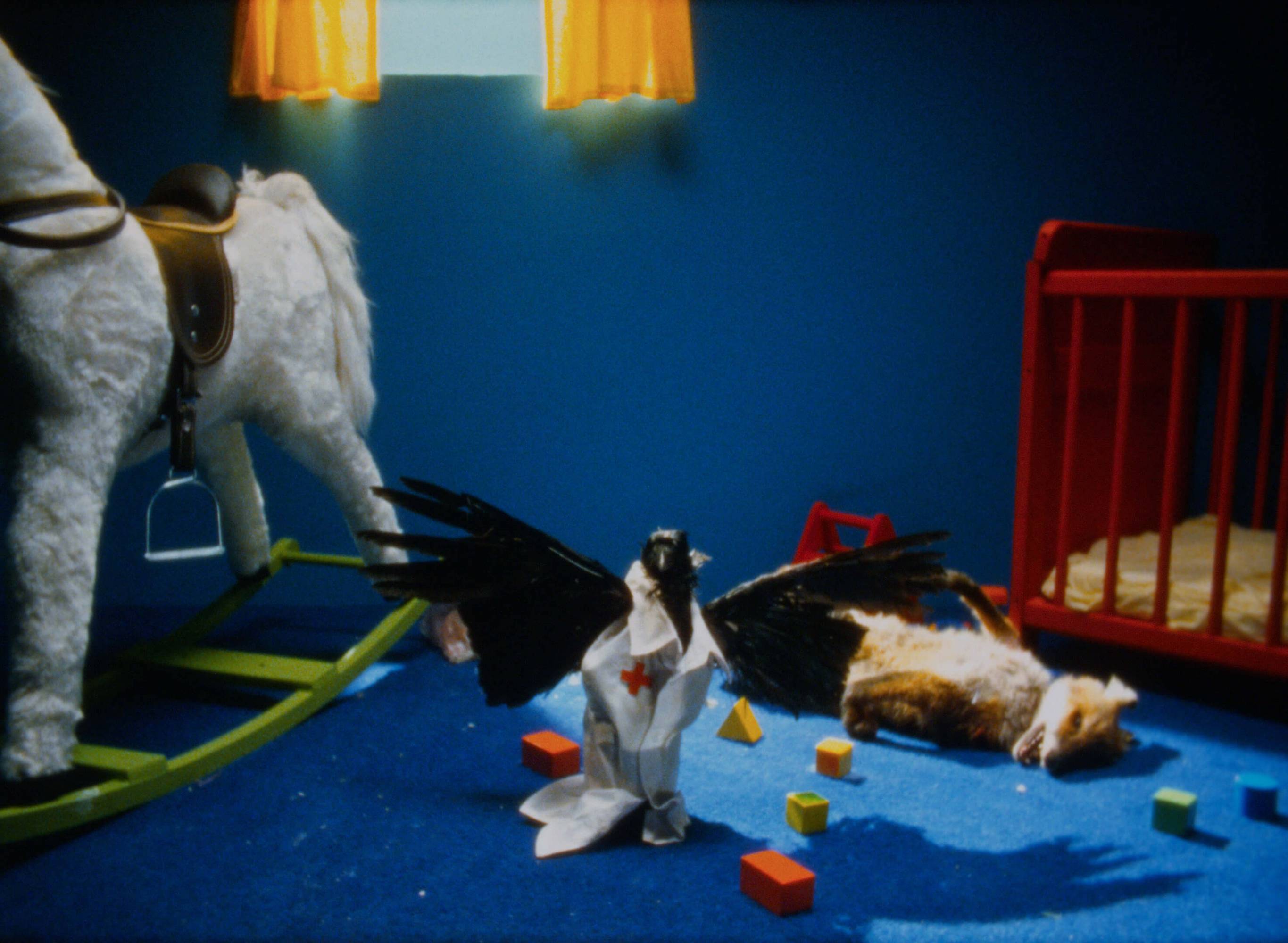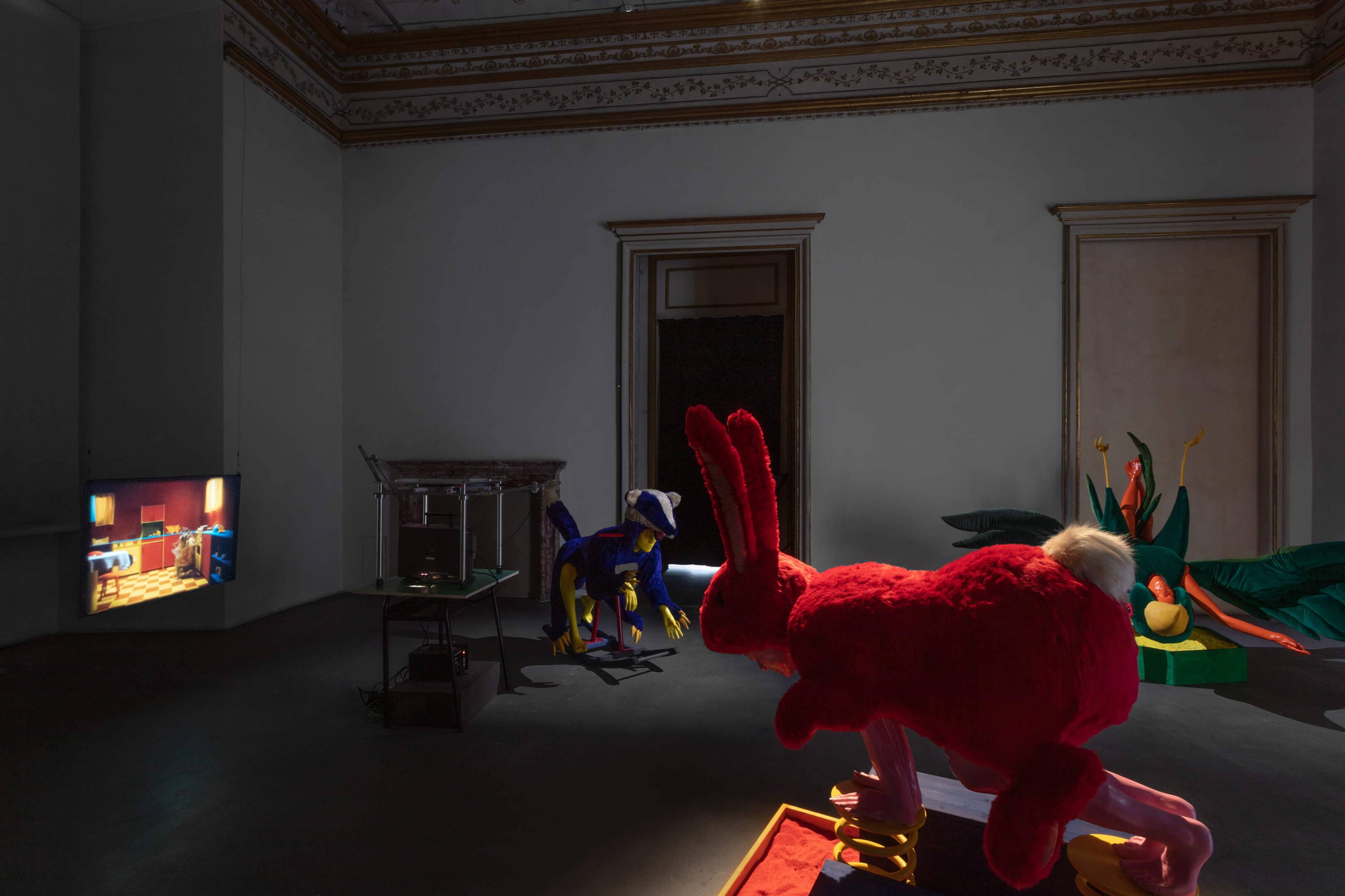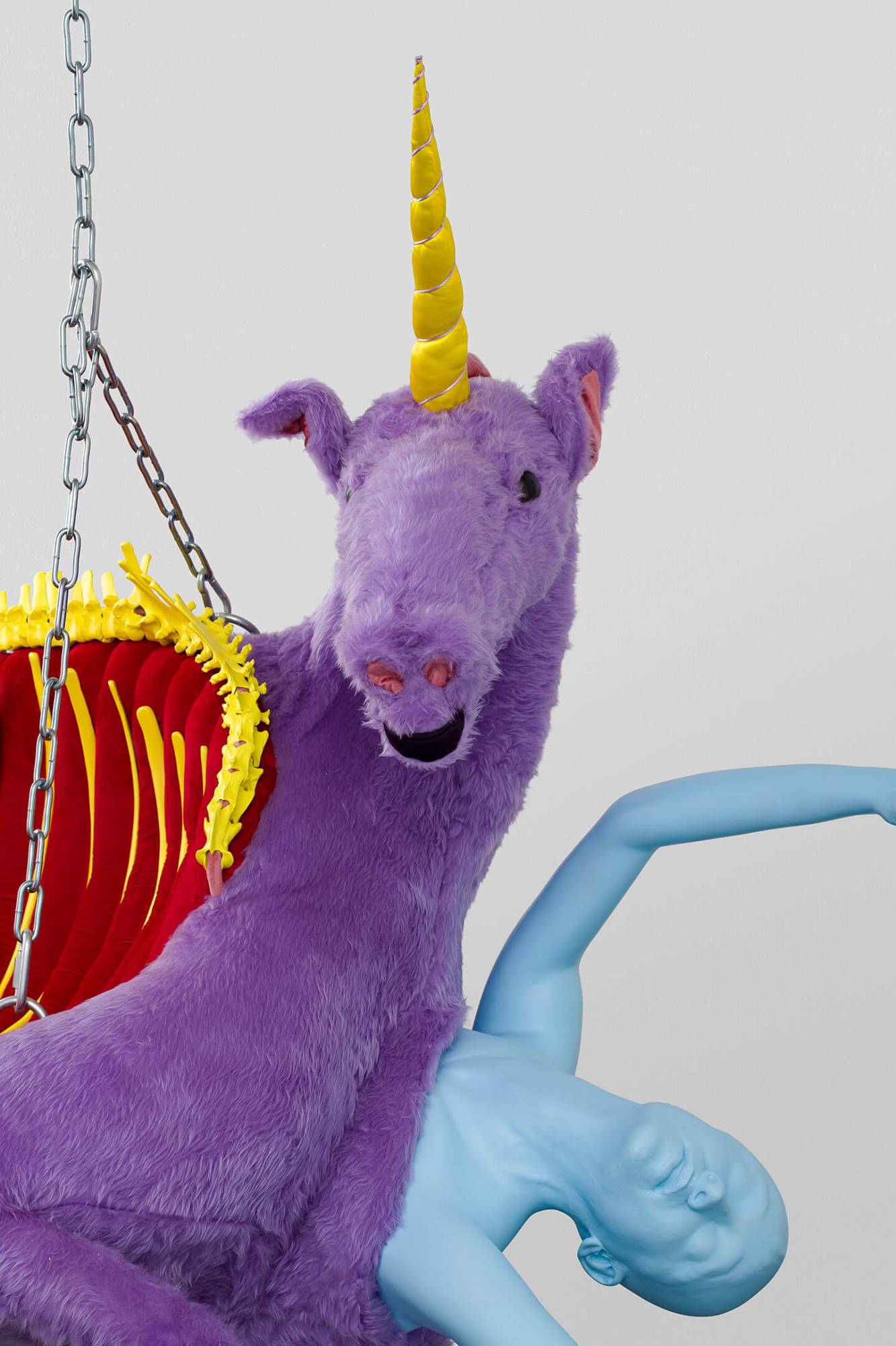 Prayers for Roadkill draws its title from a line in Adrian Piper’s journal where she expresses empathy and fascination with the micro-violence that unfolds beneath the wheels of an automobile. In Simnett’s stop motion animation film and intricate sculptures depicting hybrid human-animal creatures, she wields the aesthetic of vintage children’s television programming, soft play areas, and modernist asylums to explore the emotional and material entanglements of love and cruelty. To create the characters in her film, Simnett not only literally reanimates roadkill but reclaims – and thereby empowers – the image of the animal to plumb the depths of some of the darkest, most fundamental aspects of being human.