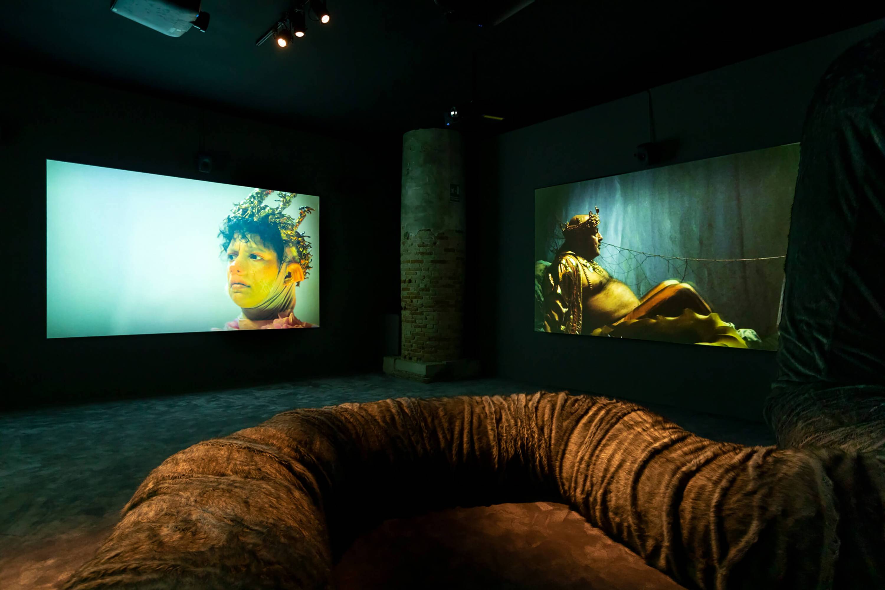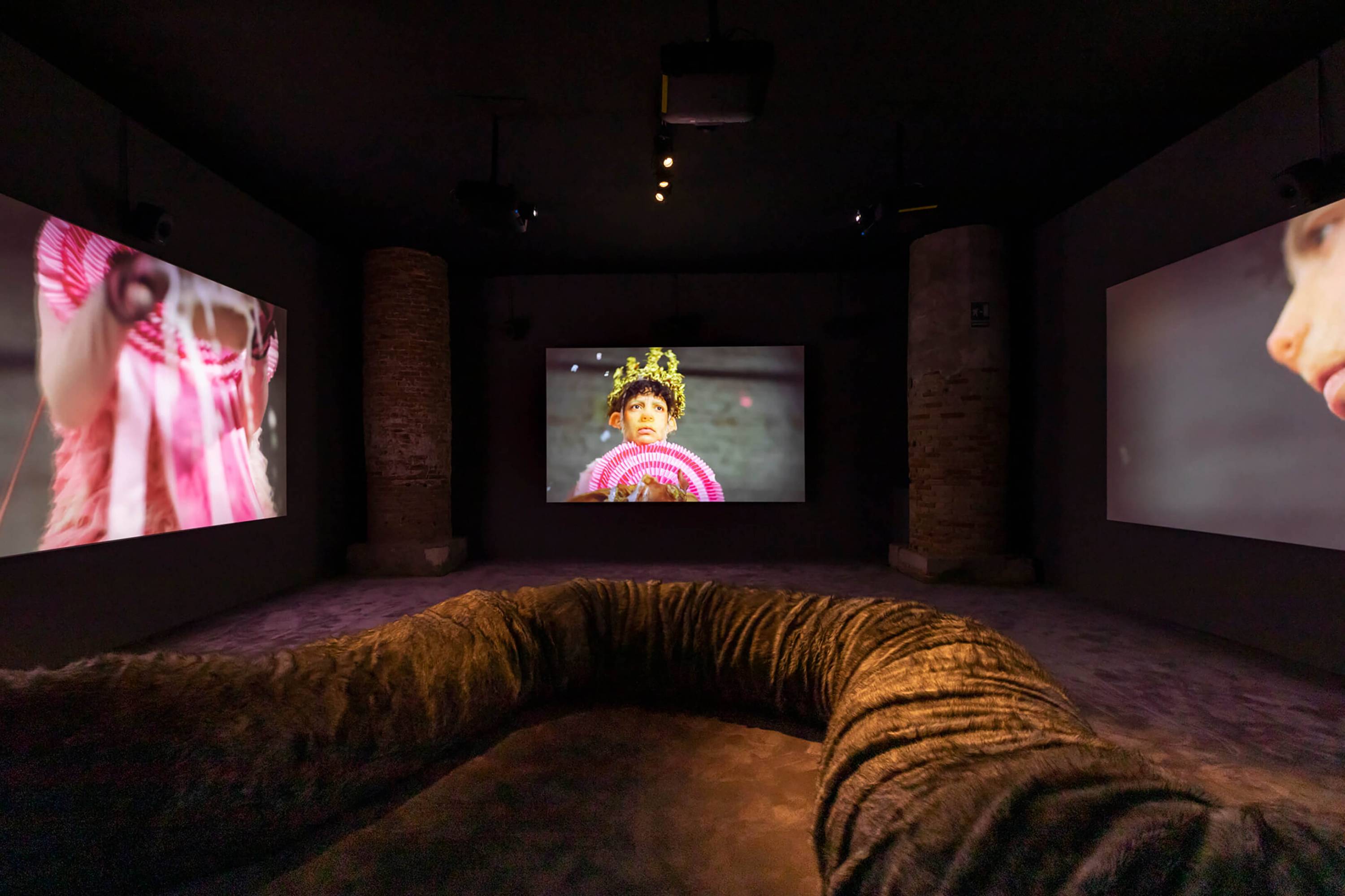 The Severed Tail follows a Piglet who embarks on a surreal journey through a fetishistic underworld after her tail has been cut off by a farmer. With a Puppy as her guide, the Piglet is subjected to a fever dream of torments—being whipped, licked, and bound into a seahorse tail. The film embraces fantasy and play as a safe space for taking possession of trauma amidst a sea of pain. To create the work, Simnett immersed herself in Pup Play and LARP communities in Berlin, with some of the people she met becoming performers in the film. The Severed Tail is shot by Robbie Ryan BSC (The Favourite, American Honey), choreographed by Kiani Del Valle, and scored by Colin Self.